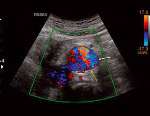 This type of Doppler uses a computer to change sound waves into different colors. These colors show the speed and direction of blood flow in real time. Power Doppler, a newer type of color Doppler. It can provide more detail of blood flow than standard color Doppler.